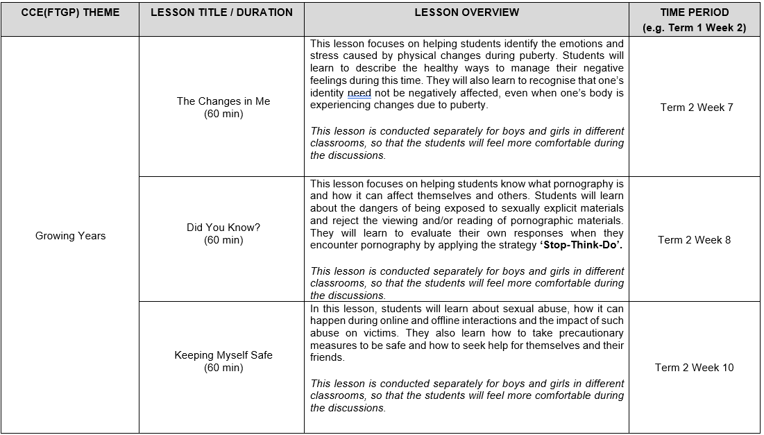 Sexuality Education (SEd) lessons are taught as part of CCE (FTGP) at Primary 5 and 6. Through these lessons, students will learn healthy ways to manage the physiological, social and emotional changes in their growing years. They learn to build healthy and rewarding relationships with others, including those with members of the opposite sex. Students are also guided to make wise, informed and responsible decisions to keep themselves safe from sexuality-related risks.